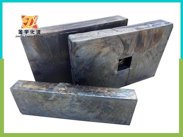 鑄石板材有普形、普異形、特異形三大類。普形板材有矩形板、梯形板、六角形板、扇形板、圓形板等;普異形板有弧形板、溜槽鑲板、灰渣溝直溝鑲板等;特異形板有:雙曲面板、錐面板、篩蓖條鑄石板及灰渣溝彎溝、變徑、匯合口、二岔口、三岔口板等。繁多的設備襯里鑄石板均包括在上述類別的制品在內。